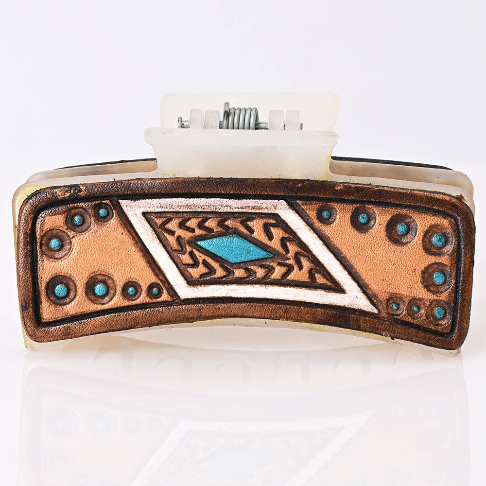 Elevate your western style with this handcrafted hair clip from American Darling. The design features a bold diamond-shaped turquoise centerpiece framed by intricate copper and white geometric tooling, creating the perfect balance of tradition and modern edge. Set on a sturdy ivory-toned claw, it offers both secure hold and Southwestern flair for everyday wear.