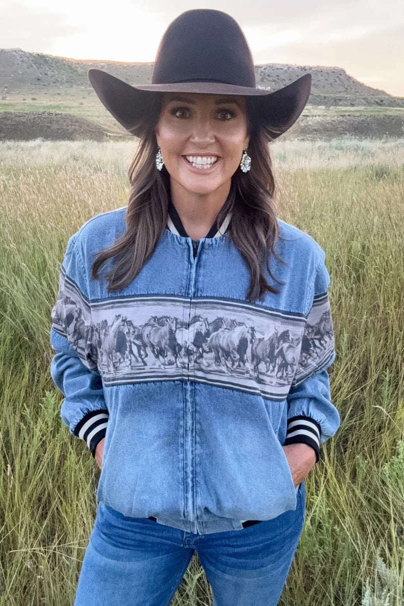 Embrace bold Western charm and free-spirited energy with the Bermuda Rush Bomber Jacket. Crafted from durable denim, this jacket captures the untamed essence of the open range with its striking design featuring a herd of galloping horses — a powerful symbol of movement and freedom.