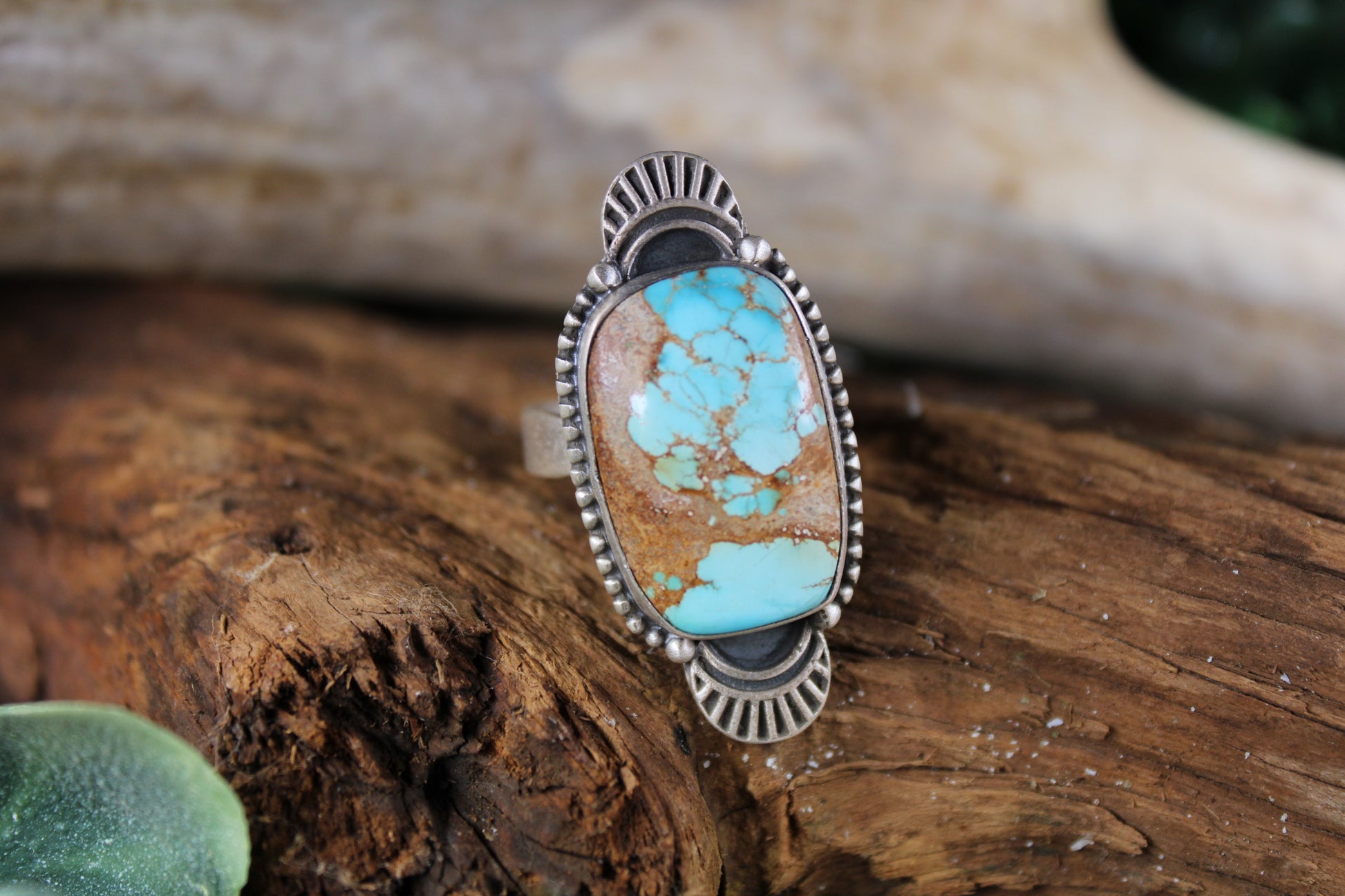 This bold and beautiful ring showcases a genuine Blue Ridge Turquoise stone, known for its brilliant sky-blue color accented with rich caramel and tan matrix patterns that mirror the rugged beauty of the Southwest. Each stone is naturally unique, giving this piece an authentic one-of-a-kind charm.