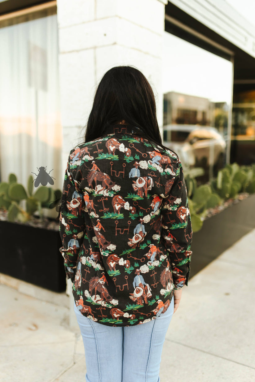 Kick up some dust and turn heads in the Brushy Pop Pearl Snap — a vintage-inspired western shirt that captures the spirit of the open range. With a bold cowboy print featuring classic rodeo scenes and desert details, this top is a modern twist on an old favorite. The pearl snap buttons and western yoke stitching give it that authentic ranchwear feel, while the 100% cotton fabric keeps it breathable, soft, and built to move with you.