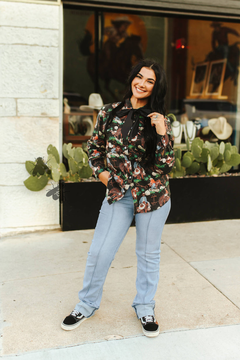 Perfect for rodeos, nights out, or layering under your favorite vest, this shirt delivers comfort and character in every stitch. Pair it with denim, fringe, or turquoise for a look that’s unapologetically western and wildly you.