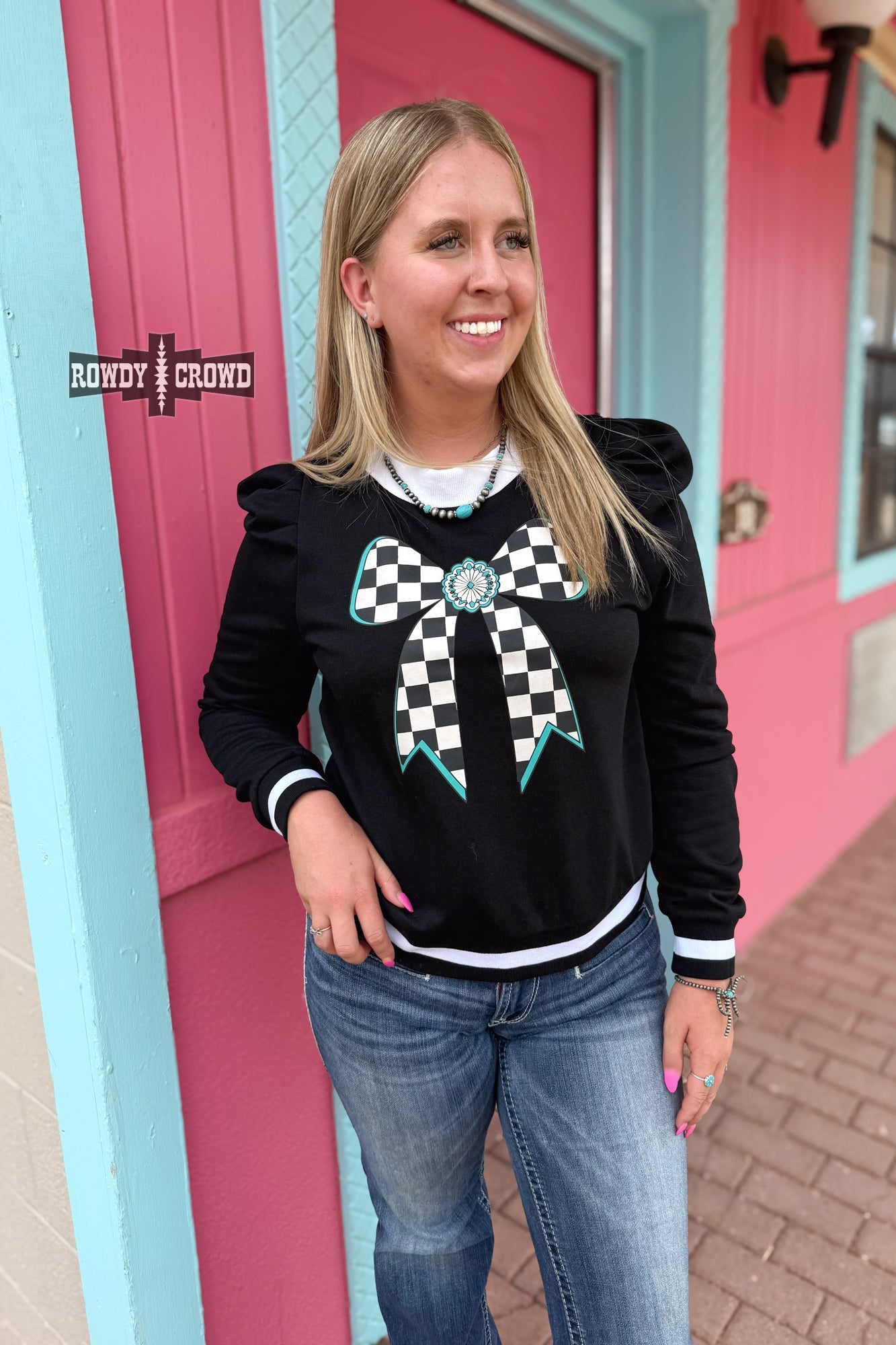 Cute, bold, and a little bit retro—the Buffalo Bow Top is serving attitude! Featuring a big checkered bow graphic front and center, contrast trim, and playful puff sleeves, it’s your go-to for comfy with a statement. Pair it with jeans, boots, or a skirt and own your look from cozy days to cool nights.