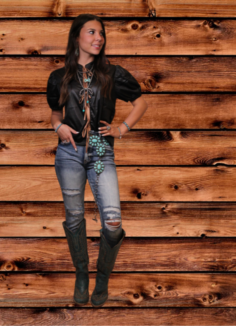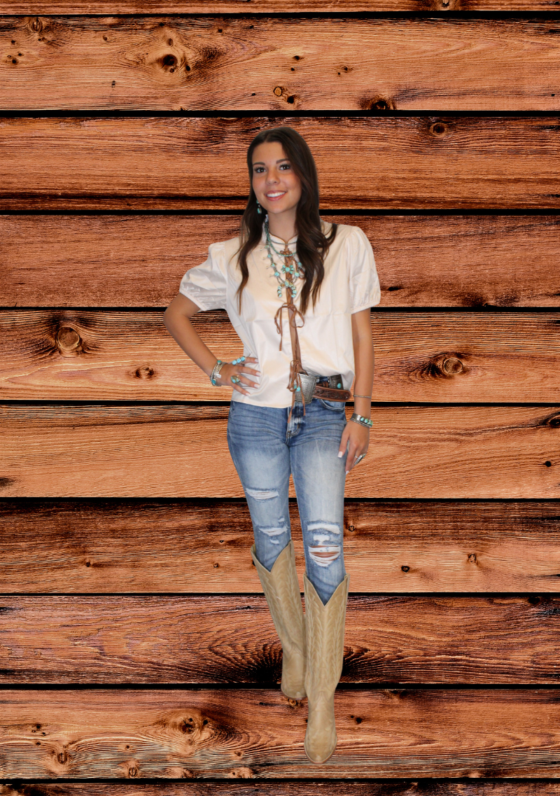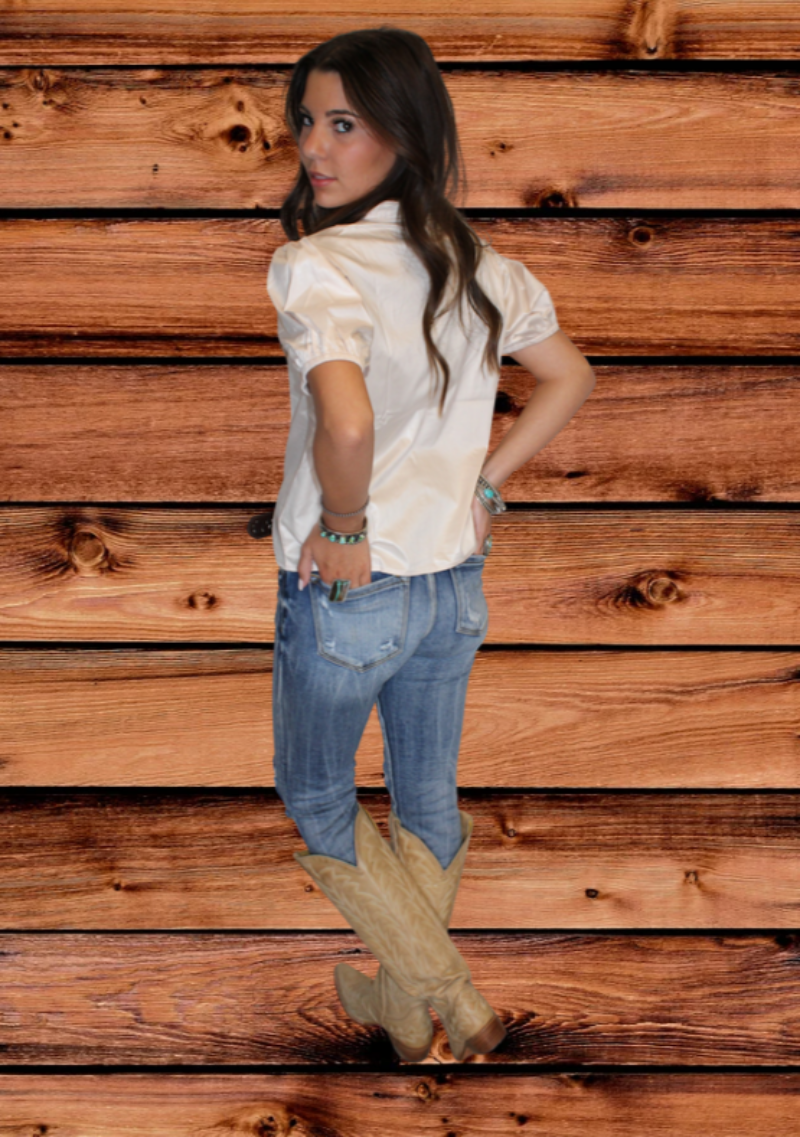 Turn heads with the effortless charm of the Calhoun Top. Made from smooth satin for a touch of elegance, this blouse features puff sleeves and a saddle front tie closure that adds the perfect western-inspired detail. Designed for comfort and style, it’s a versatile piece that pairs beautifully with denim, boots, and your favorite turquoise jewelry.