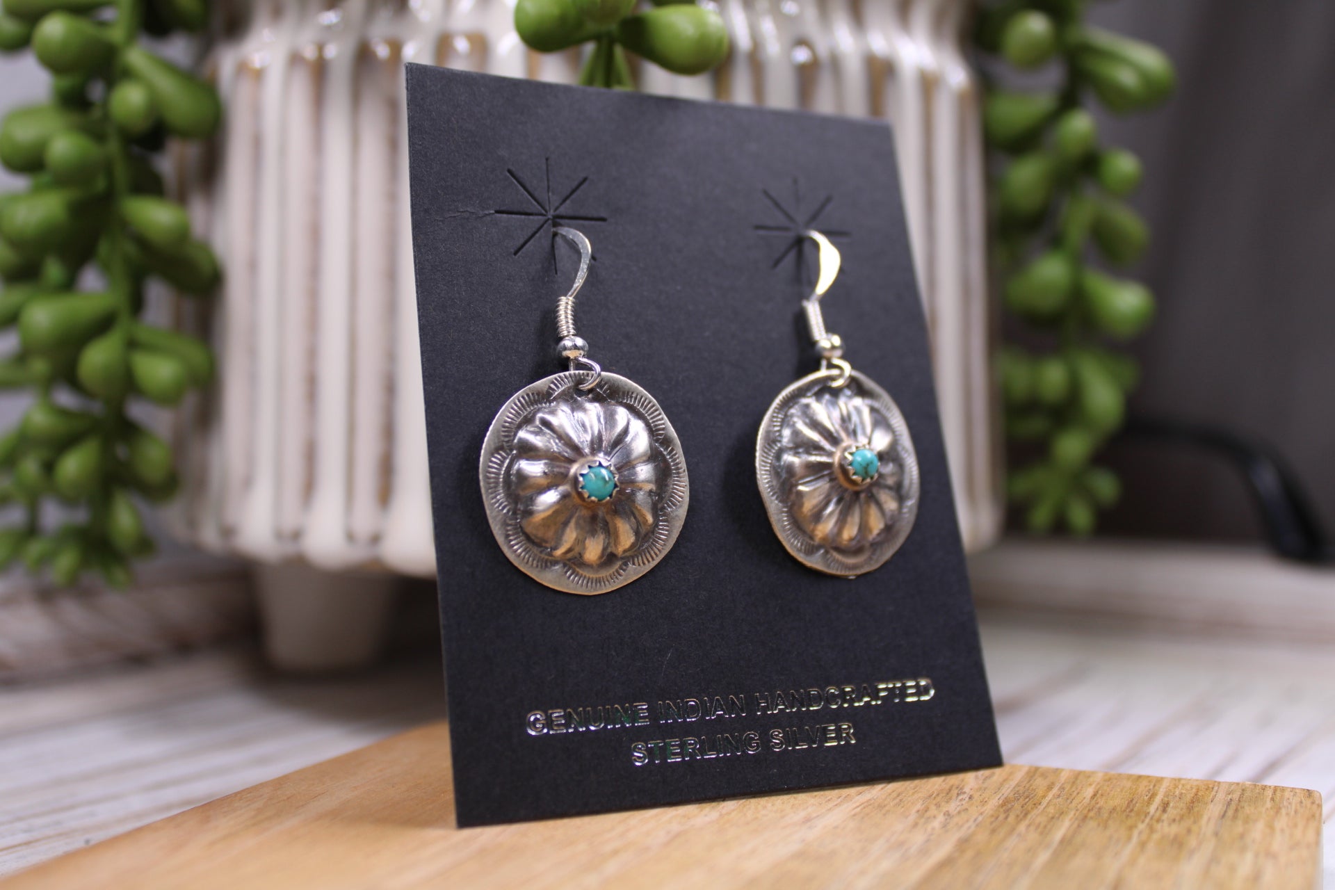 These handmade concho earrings are a stunning example of authentic Navajo silversmithing by artist Joan Begay. Each earring is carefully crafted from .925 sterling silver, featuring a beautifully hand-stamped concho design with a raised floral center and a single genuine turquoise stone set in the middle.