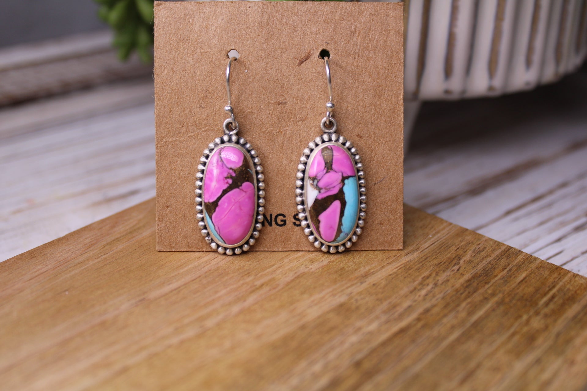 These stunning earrings feature genuine Cotton Candy Turquoise, a vibrant fusion of bright pink, sky blue, white, and bronze matrix that creates a playful yet elegant look. Each oval stone is completely unique, radiating color and charm that perfectly captures the bold spirit of the Southwest.