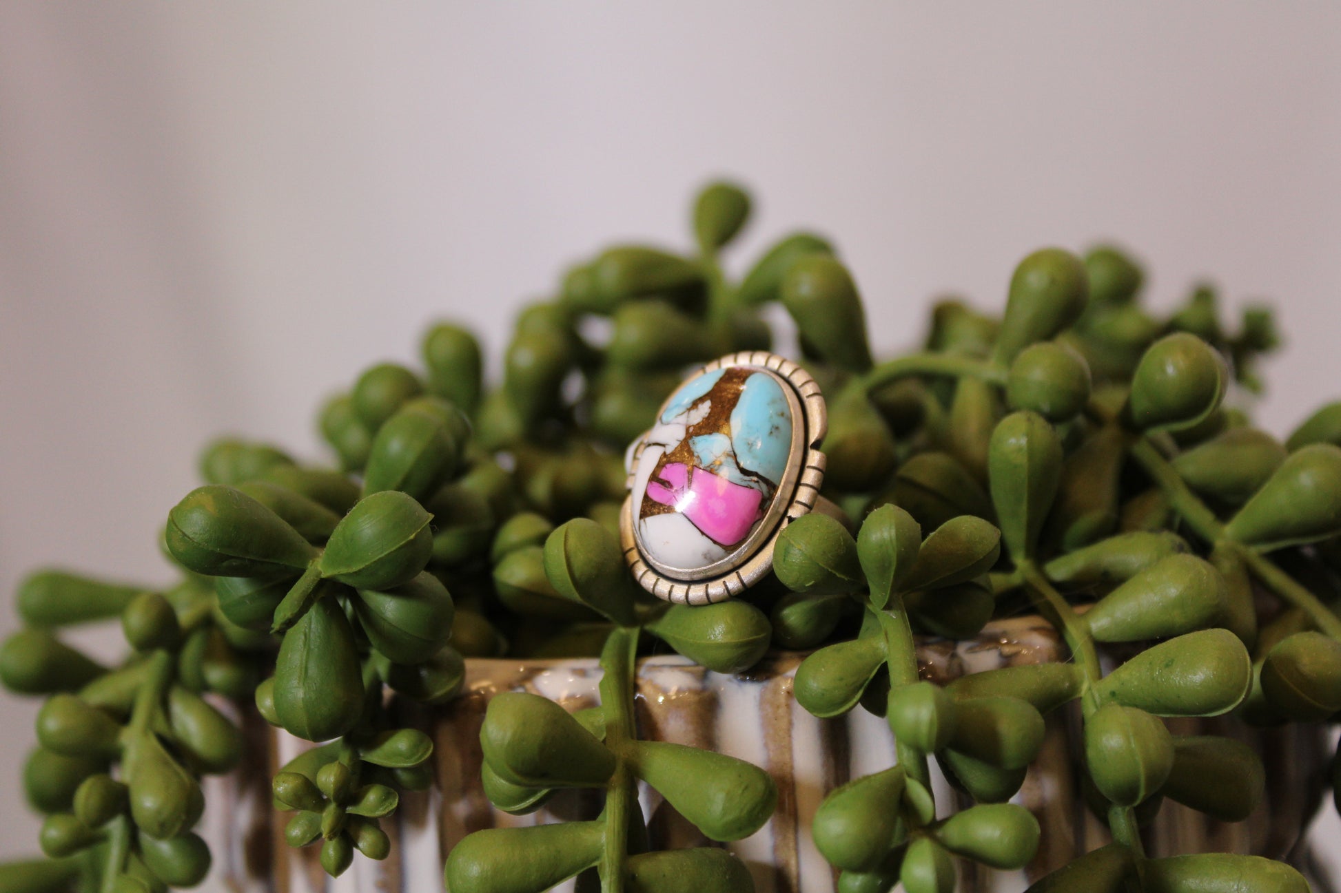 This stunning Cotton Candy turquoise ring bursts with color, showcasing a unique blend of vibrant pink, sky blue, and creamy white tones with delicate golden matrix veins. The bold oval stone is framed in a sterling silver bezel with hand-stamped details, giving it an elegant yet rustic Southwestern flair.