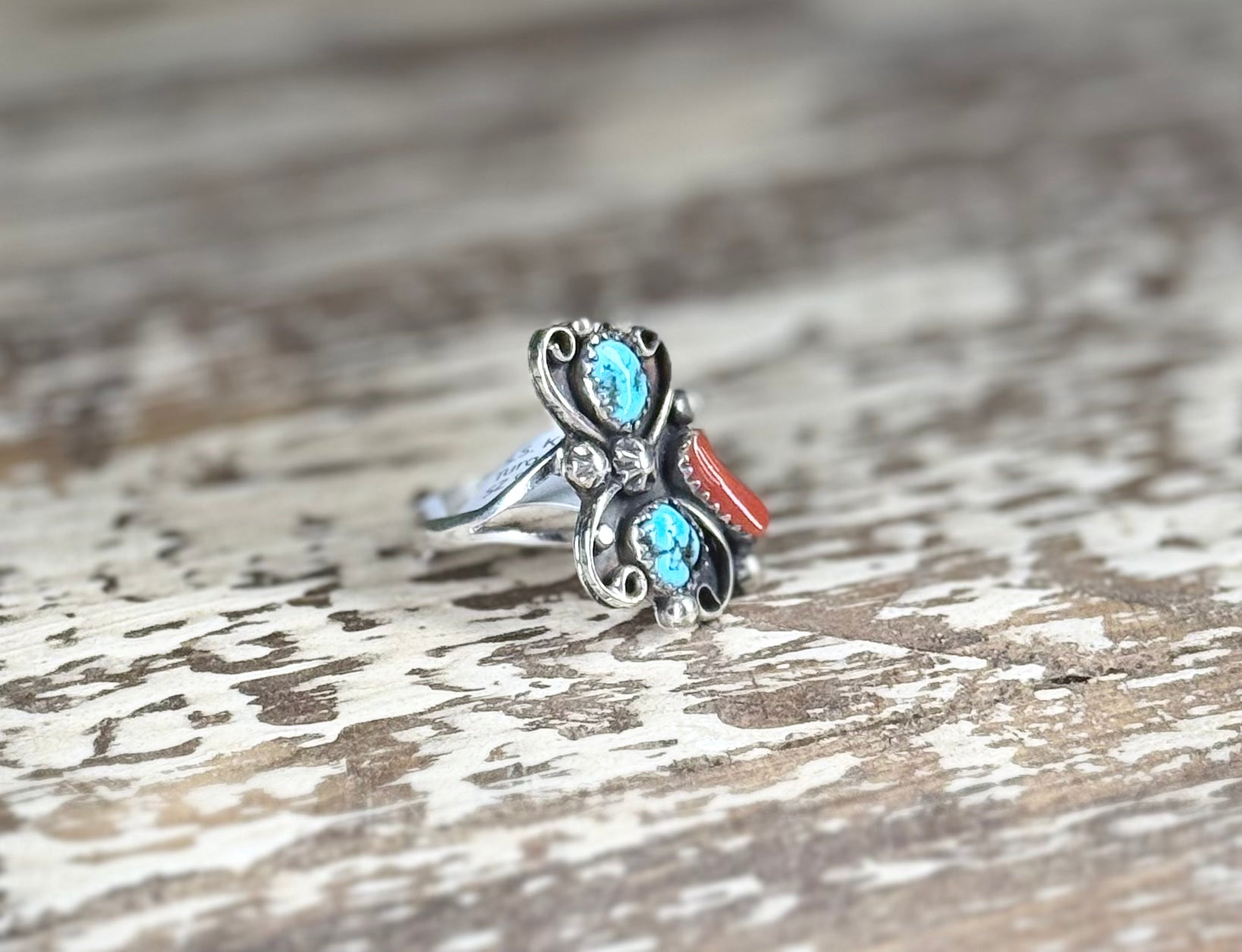 Crafted by Navajo silversmith David Morris, this vintage-inspired ring showcases a beautiful blend of Kingman turquoise and red coral—a classic pairing in traditional Native American jewelry. The ring features three natural turquoise stones with a rich sky-blue hue, accented by a single branch of red coral.