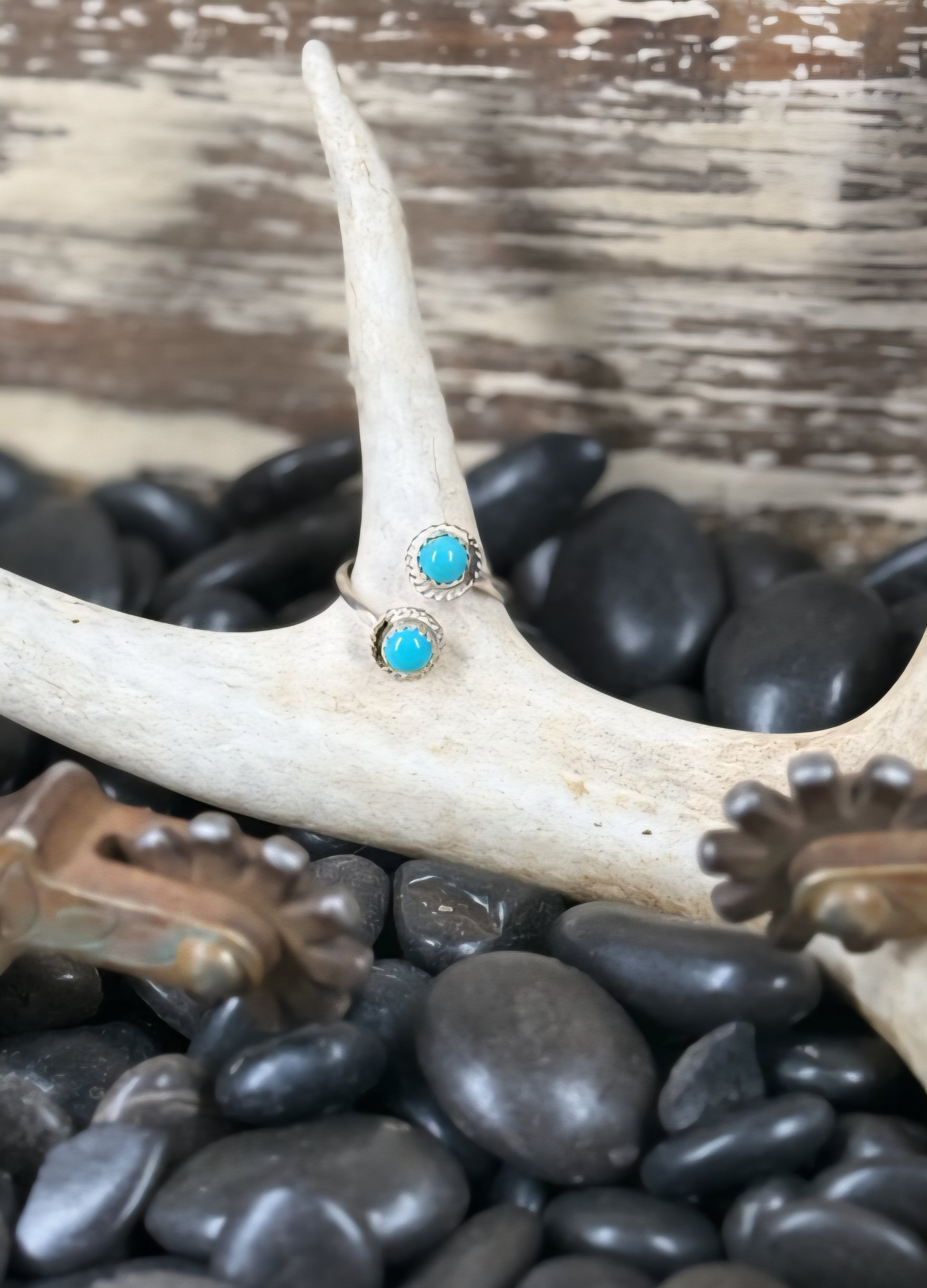 Delicate, timeless, and full of Southwestern charm—this handcrafted sterling silver ring by Navajo artist Esther White features two round Kingman turquoise stones, each set in classic hand-twisted rope bezels. The vibrant sky-blue stones, sourced from the famous Kingman mine in Arizona, add a perfect pop of natural color.
