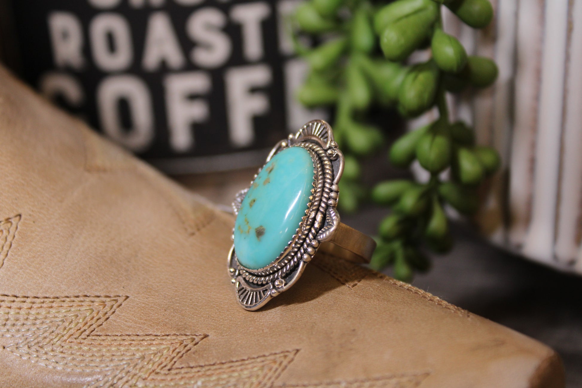 A bold yet elegant statement ring that highlights the natural beauty of Kingman turquoise and the craftsmanship of sterling silver.