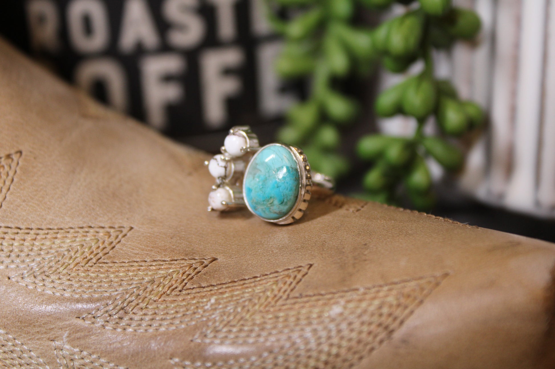 This bold handmade ring showcases a stunning blend of Mojave turquoise and Wild Horse stone, set in a hand-crafted sterling silver design. The vibrant turquoise stone contrasts beautifully with the creamy white and earthy brown tones of Wild Horse, making this piece a true statement of Southwestern artistry. The adjustable band ensures a comfortable fit for multiple sizes.