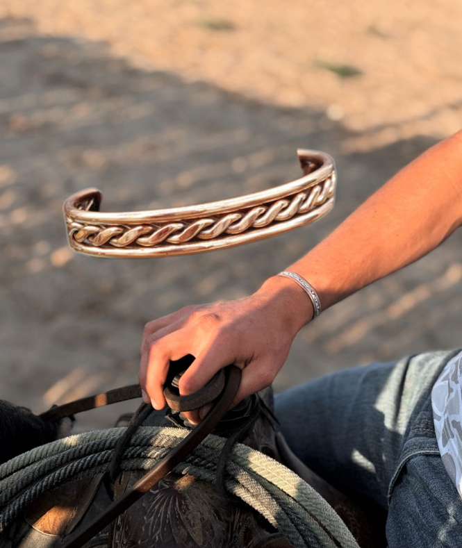 Designed with straight sides for a clean, classic profile, this cuff blends durability with a warm, earthy glow that deepens with age. Perfect for daily wear, it makes a striking unisex accessory that complements both ranch workwear and Western dress attire.