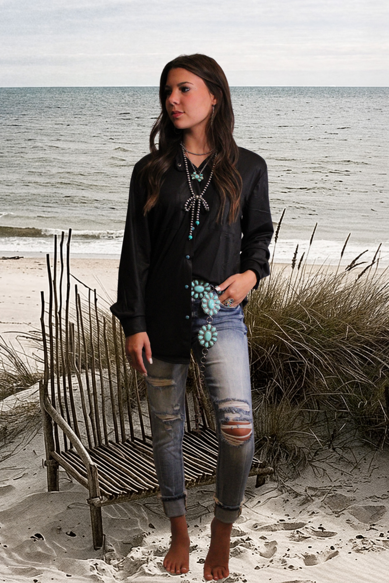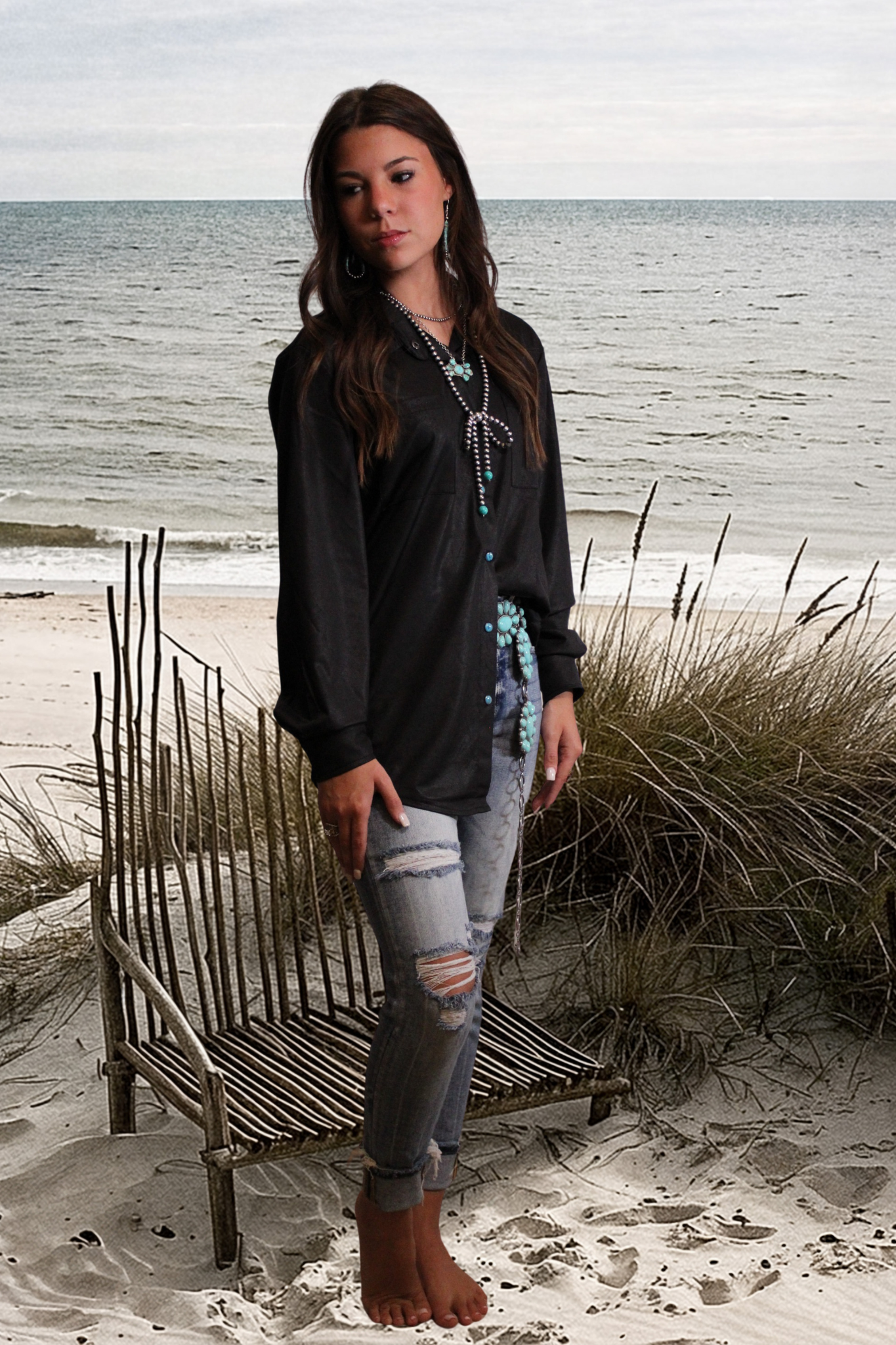 Elevate your western wardrobe with the Leather Lux Button-Up Shirt, where comfort meets high-end cowgirl chic. Crafted with a sleek leather-look finish, this top brings effortless style whether you’re in the arena or out on the town. The turquoise snap button closure adds a pop of color and authentic western flair, while the 90% polyester / 10% spandex blend gives just the right amount of stretch for all-day comfort.