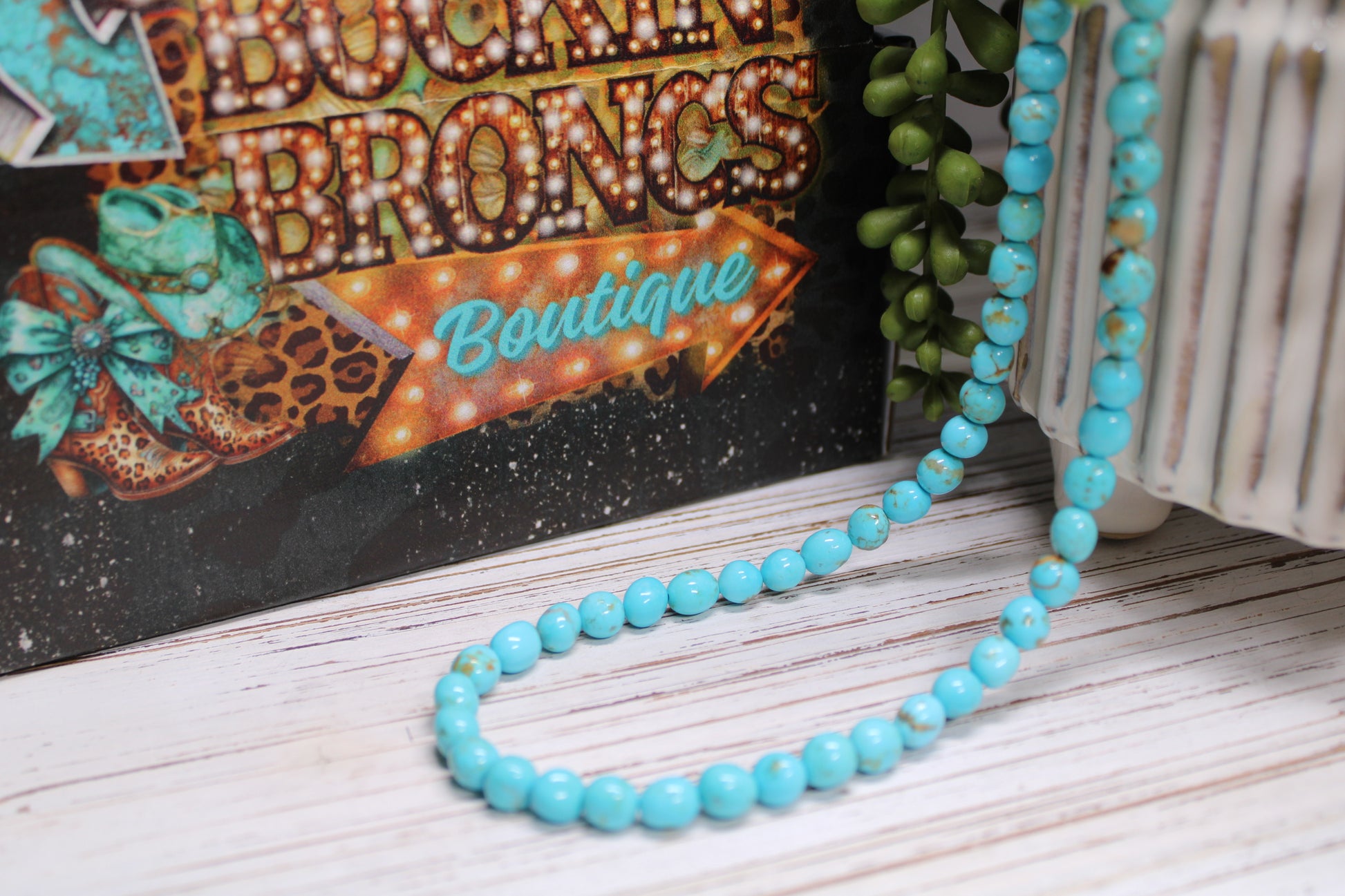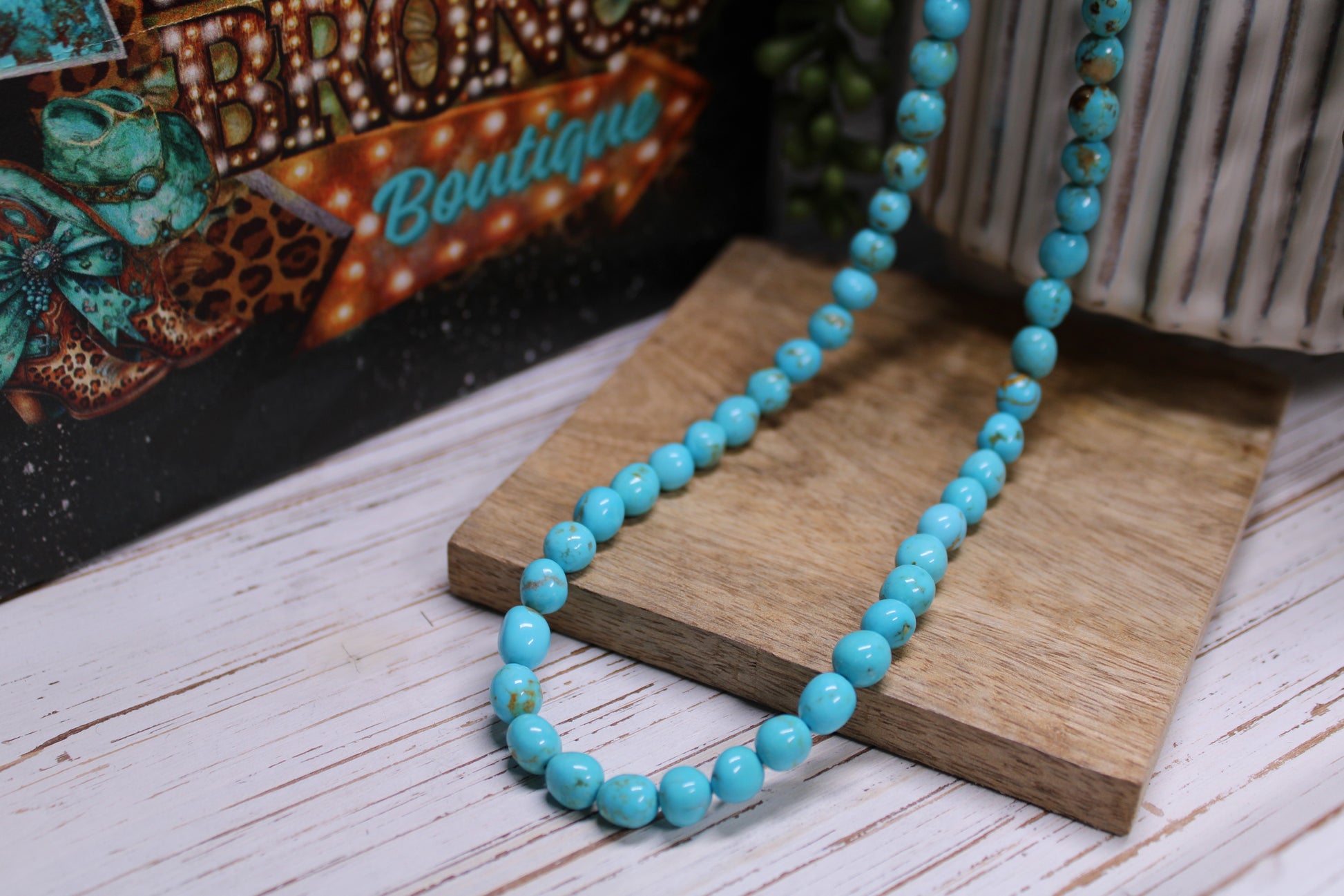 This stunning 18-inch necklace is handcrafted by Navajo artist Naomi Garcia, featuring genuine Nevada Turquoise beads hand-selected for their beautiful blend of sky-blue tones and natural matrix. Each bead is shaped, polished, and hand-strung with precision, creating an elegant strand that captures the earthy, vibrant character of authentic Southwestern turquoise.