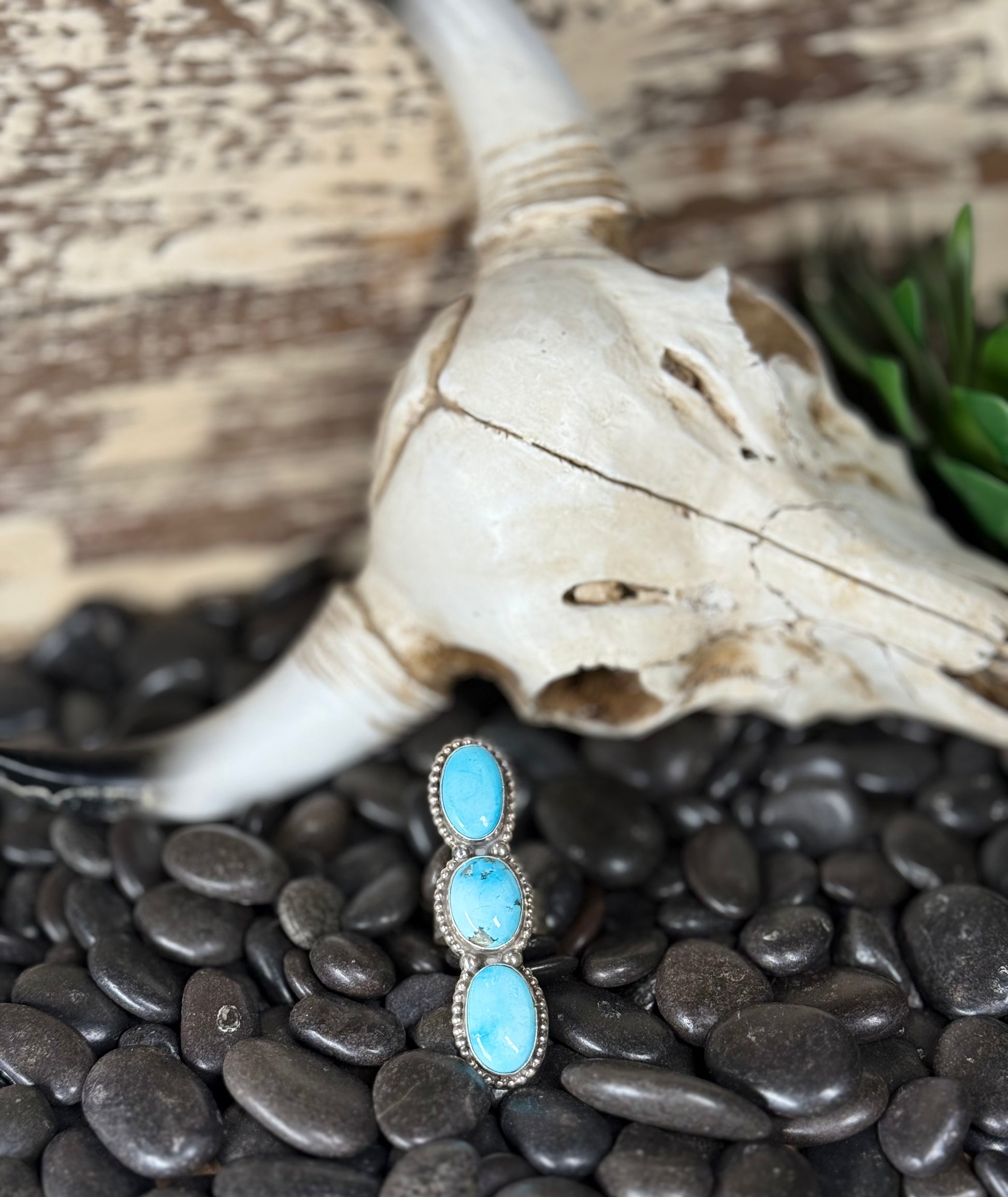 Crafted by Navajo silversmith Sheila Becenti, this bold statement ring features three hand-set Kingman turquoise stones in a vertical row, each showcasing unique sky-blue tones and natural matrix. Framed in traditional sterling silver rope and beadwork, this piece reflects timeless Southwestern elegance and craftsmanship.