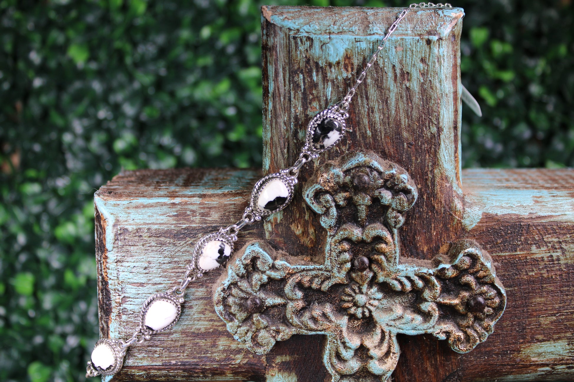 This elegant necklace features genuine Tonopah White Buffalo Turquoise, celebrated for its bold contrast of crisp white stone with striking black matrix patterns. Each stone is naturally unique, creating a distinctive and timeless look that pairs effortlessly with both casual and dressy western styles.
