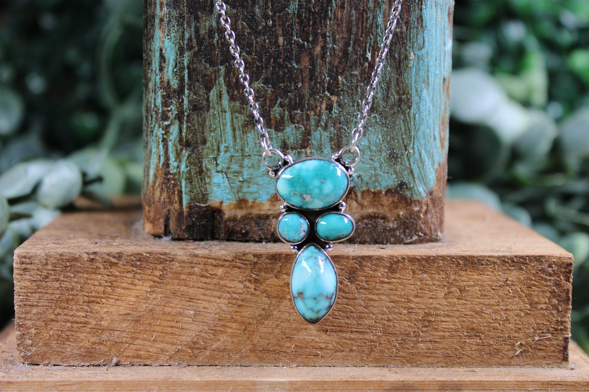 This elegant necklace features genuine White Water Turquoise, prized for its rich sky-blue hue with delicate white and brown matrix patterns that evoke the beauty of flowing desert rivers. The pendant showcases a graceful cluster of four natural stones, each uniquely shaped and set in polished .925 sterling silver, creating a timeless southwestern look.