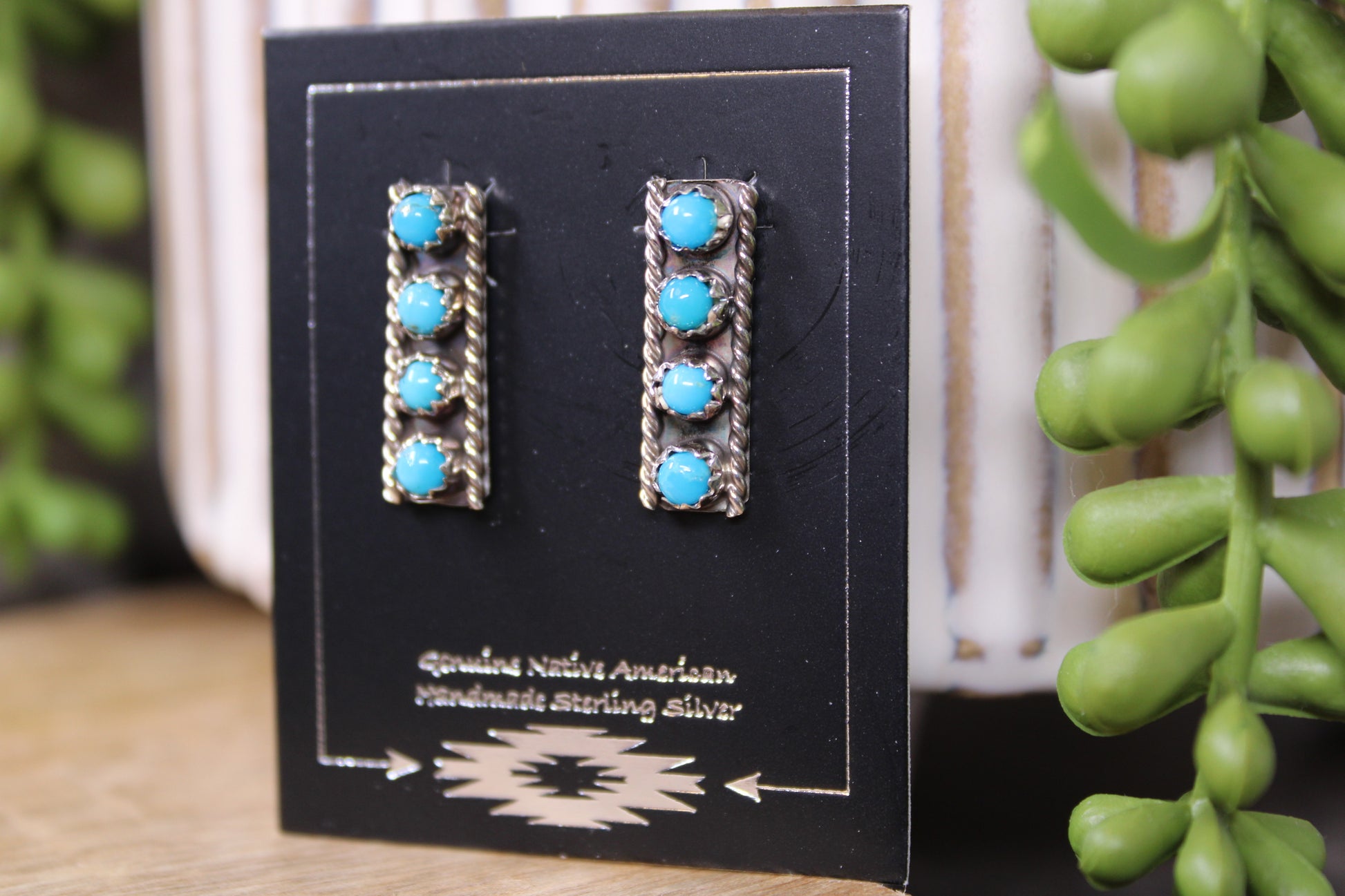 The vertical drop design highlights the bright turquoise stones, making these earrings a timeless and versatile addition to any jewelry collection. While these pieces are not stamped, they are unmistakably authentic, showcasing the hallmark detail and artistry of Native silversmith tradition.